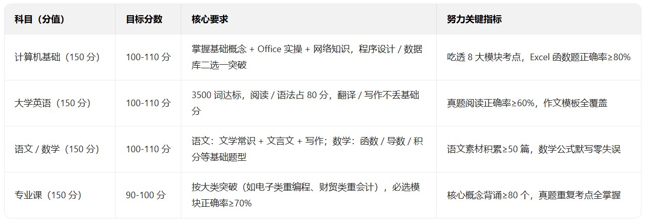 注:若某科基础薄弱(如数学仅能考 80 分),需在优势科目(如计算机)冲刺 120 分以上补差距,这意味着要在优势科目上投入额外 30% 的复习时间。