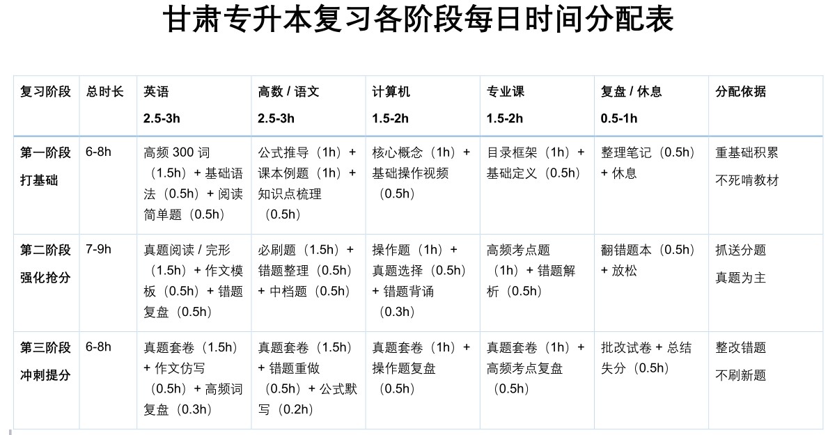 甘肃专升本复习想高效提分,科学的时间分配是关键。这里有一份张老师为你准备好的每日时间分配表,按 “基础 - 强化 - 冲刺” 三阶段规划:考前 180 天打基础,每天 6-8 小时聚焦核心内容,英语背高频词、高数 / 语文练公式例题,少啃教材更高效;考前 90 天强化抢分,7-9 小时主攻真题与送分题,错题复盘别忽视;考前 30 天冲刺,6-8 小时刷套卷改错题,不浪费时间刷新题。跟着这份规划走,每科复习有方向,效率拉满,助力稳冲目标分数。