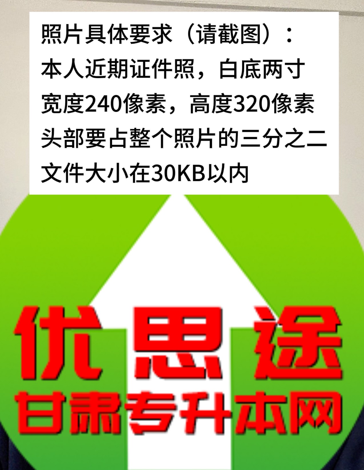 甘肃专升本报名,必须上传电子版的近期证件照,要求很严:宽度240像素,高度320像素,头部要占整个照片的三分之二以上,文件大小必须在30KB以内,白底两寸。不然传不上。