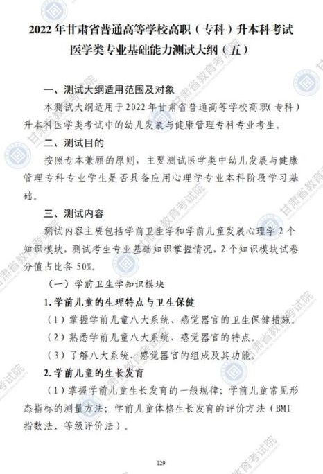 2022年甘肃专升本医学大类(五)专业基础课考试大纲大纲适用:2022年甘肃专升本医学类所有专业普通考生以下2022年甘肃专升本考试专业能力测试大纲(专业课大纲)由甘肃省教育考试院官方网站发布,本站仅作转载,具体详细内容以官方发布为准(点击这里)。 2022/2/26 更新