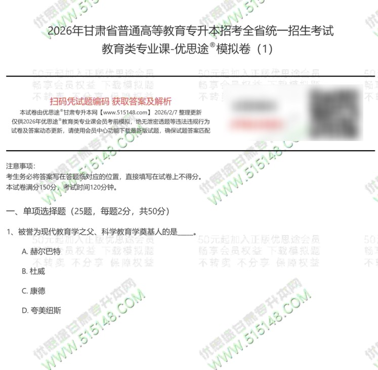 按历年的惯例,优思途甘肃专升本网2026年甘肃专升本教育类考前冲刺模拟题,已经于2026年2月5日发布更新。我们优思途的专业课冲刺模拟题参考了2022-2025年的甘肃专升本教育类(教育学+心理学)考生真题回忆,结合新版专业课考试大纲适当扩展。题型、分值、出题难度均与原题接近。今年的教育类专业课模拟题一共5套,模拟题中已经包含近三年教育类真题,请小伙伴一定下载、打印、练习。认真对待。