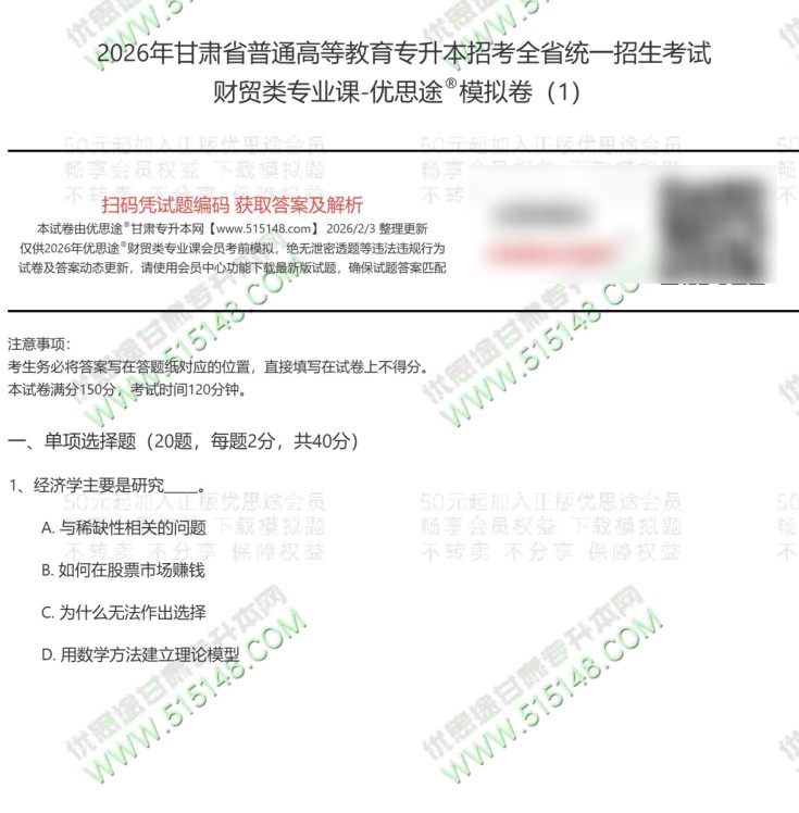 按历年的惯例,优思途甘肃专升本网2026年甘肃专升本财贸类考前冲刺模拟卷,已经于2026年2月5日发布更新。我们优思途的专业课冲刺模拟题参考了2022-2025年的甘肃专升本财贸类(微观经济学+基础会计学)考生真题回忆,结合新版专业课考试大纲适当扩展。题型、分值、出题难度均与原题接近。今年的财贸类专业课模拟题一共5套,模拟题中已经包含近三年财贸类真题,请小伙伴一定下载、打印、练习。认真对待。