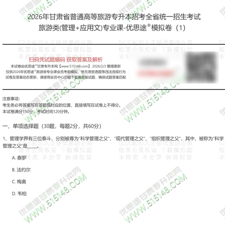 按历年的惯例,优思途甘肃专升本网2026年甘肃专升本旅游管理类考前冲刺模拟卷,已经于2026年2月5日发布更新。我们优思途的专业课冲刺模拟题参考了2022-2025年的甘肃专升本旅游管理类(管理学+旅游学+酒店管理+应用文)考生真题回忆,结合新版专业课考试大纲适当扩展。题型、分值、出题难度均与原题接近。今年的旅游管理类专业课模拟题一共5套,模拟题中已经包含近三年旅游管理类真题,请小伙伴一定下载、打印、练习。认真对待。