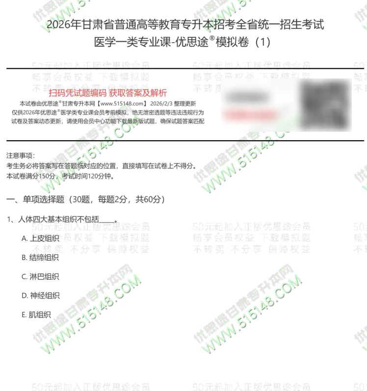 按历年的惯例,优思途甘肃专升本网2026年甘肃专升本医学一考前冲刺模拟卷,已经于2026年2月5日发布更新。我们优思途的专业课冲刺模拟题参考了2022-2025年的甘肃专升本医学一类(解剖学+生理学)考生真题回忆,结合新版专业课考试大纲适当扩展。题型、分值、出题难度均与原题接近。今年的医学一类专业课模拟题一共5套,模拟题中已经包含近三年医学一类真题,请小伙伴一定下载、打印、练习。认真对待。