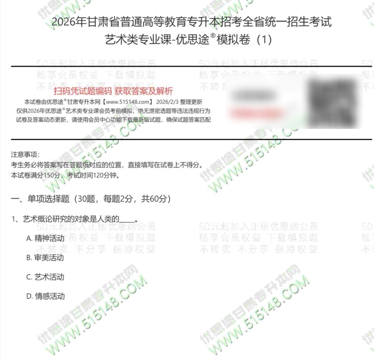 按历年的惯例,优思途甘肃专升本网2026年甘肃专升本艺术类考前冲刺模拟卷,已经于2026年2月5日发布更新。我们优思途的专业课冲刺模拟题参考了2022-2025年的甘肃专升本艺术类(艺术概论+艺术欣赏)考生真题回忆,结合新版专业课考试大纲适当扩展。题型、分值、出题难度均与原题接近。今年的艺术类专业课模拟题一共5套,模拟题中已经包含近三年艺术类真题,请小伙伴一定下载、打印、练习。认真对待。