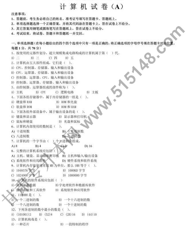 小提示:本试题大题部分为文史财经类要求。其余部分为公共课计算机考试大纲统一要求。