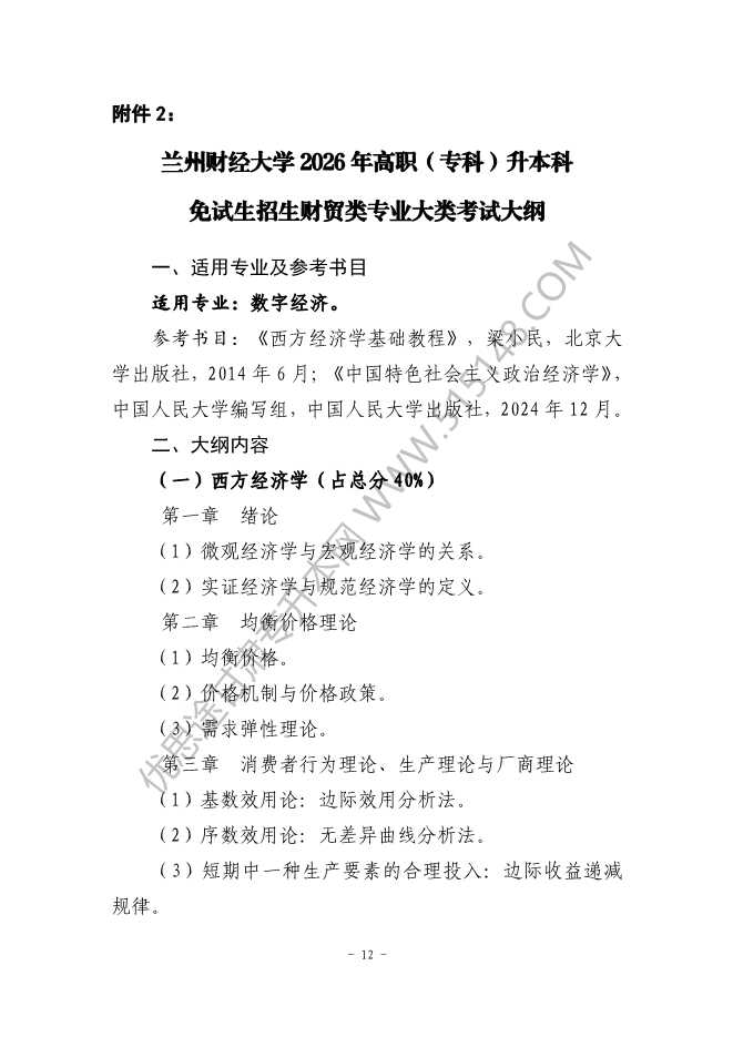 大纲适用:2026年兰州财经大学专升本考试财贸类所有专业免试生专业校测