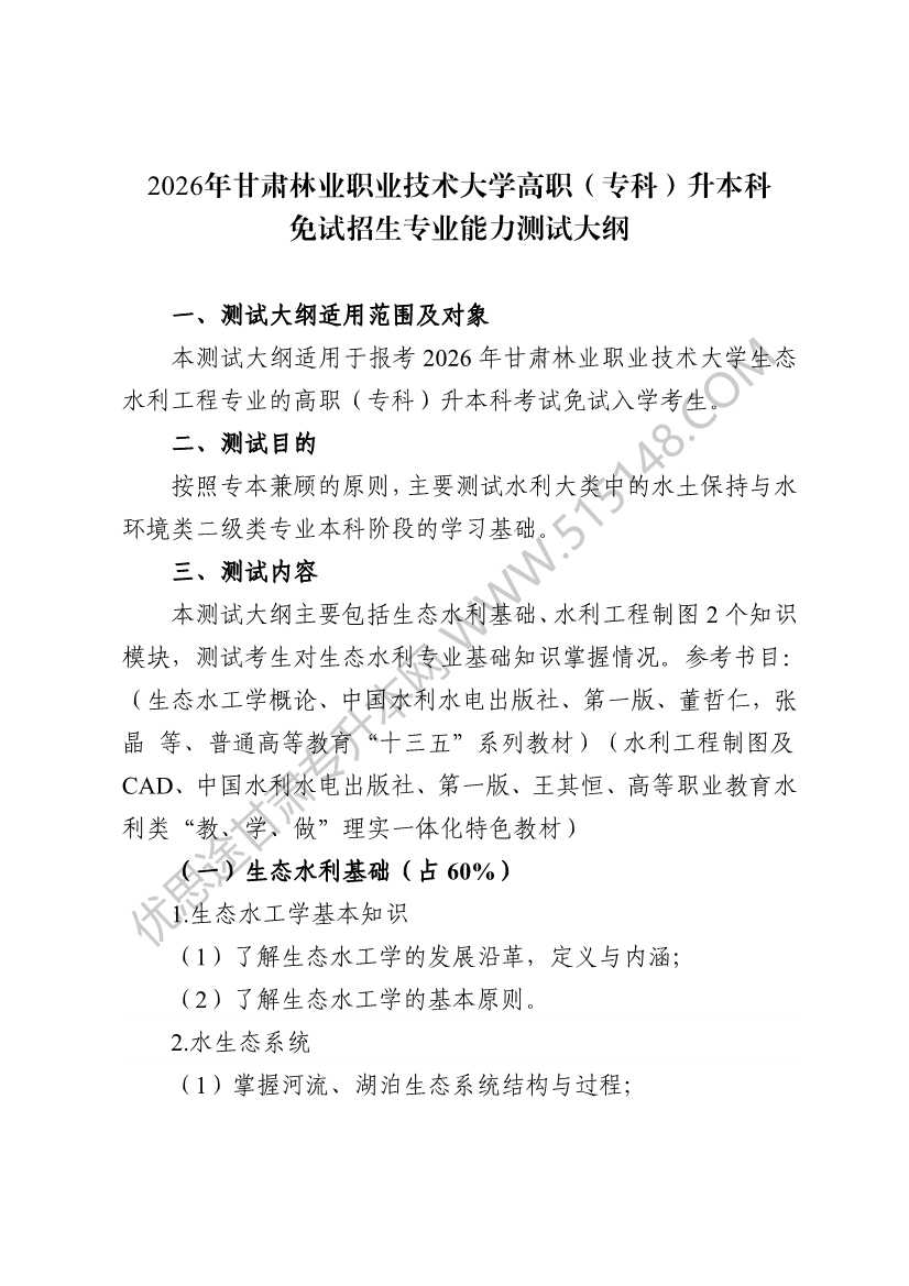 2026年甘肃林业职业技术大学土建类生态水利工程专业免试生能力测试大纲