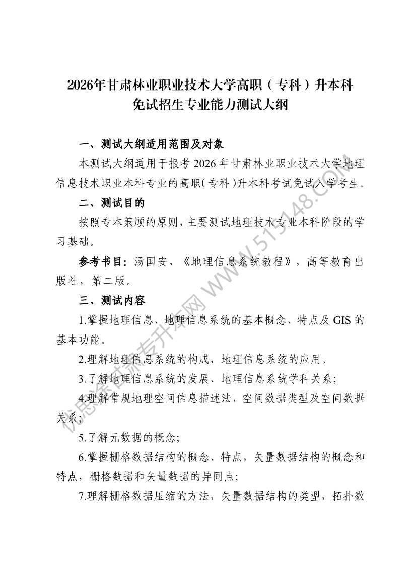 2026年甘肃林业职业技术大学资源类地理信息技术专业免试生能力测试大纲