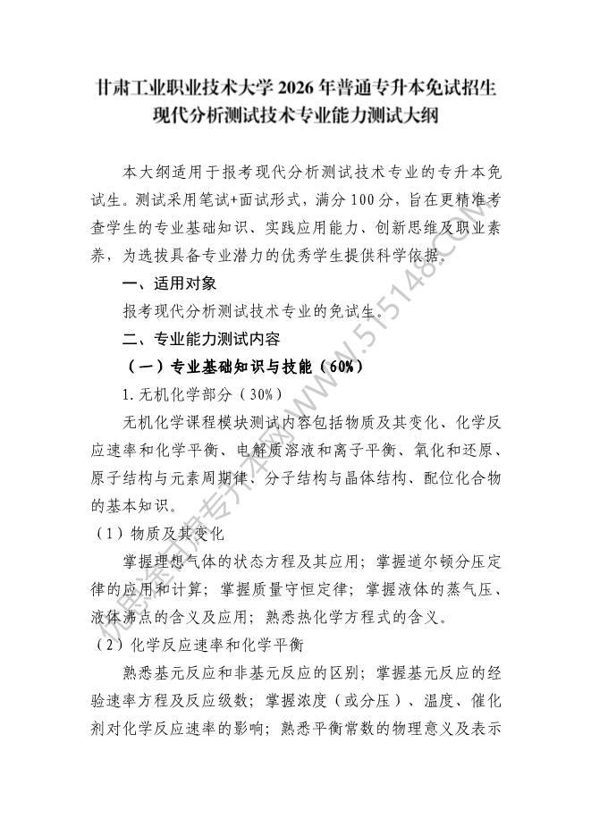大纲适用:2026年甘肃工业职业技术大学专升本考试生化类所有专业免试生专业校测