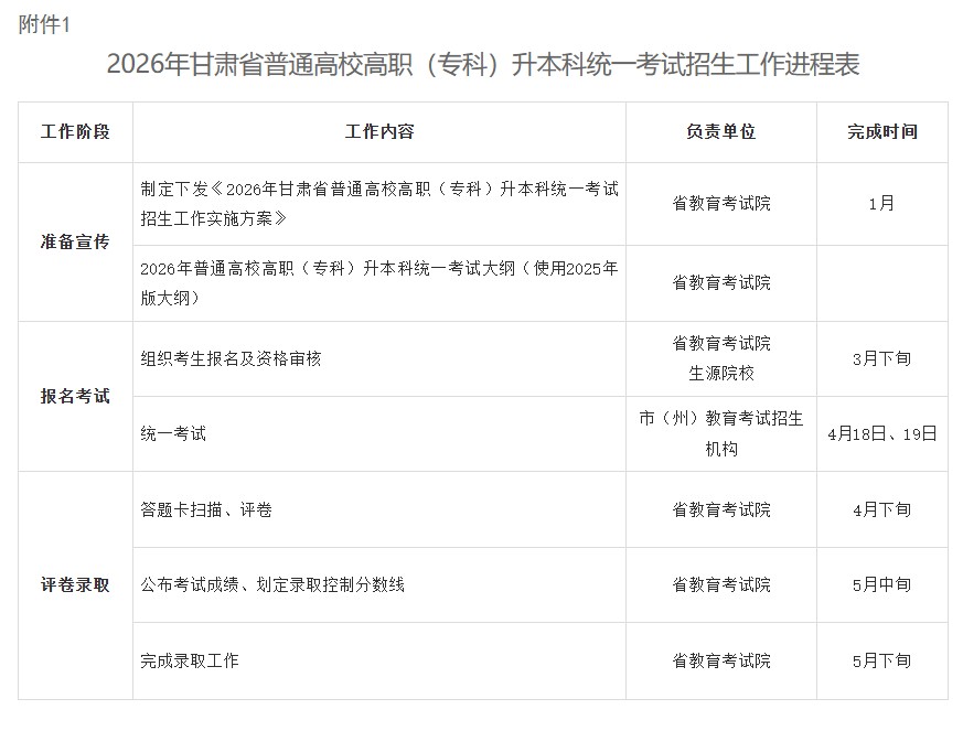 1.2026年甘肃省普通高校高职(专科)升本科统一考试招生工作进程表