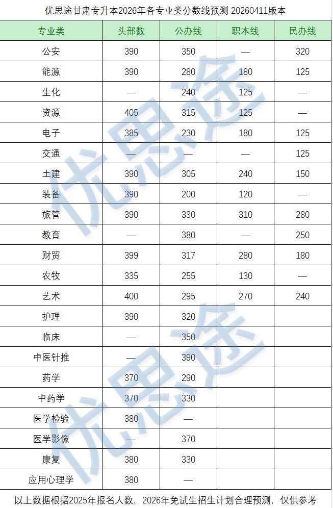 优思途甘肃专升本2026年各专业类分数线预测 20260411版本。以下数据根据2025年报名人数,2026年免试生招生计划合理预测,仅供参考。