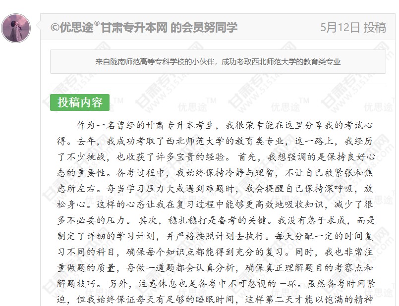 TAGS:甘肃专升本 心得分享内容摘要:我是一名甘肃专升本艺术类的考生,通过优思途开启了备考之旅。短短一个月时间,依托优思途网站丰富且专业的课程,我全身心投入学习,最终在考试中取得了理想成绩,成功叩响梦想学府之门。...